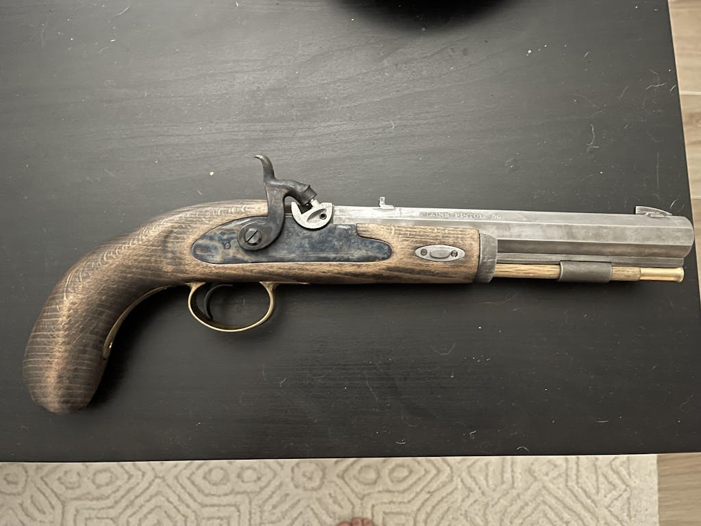 The richly stained walnut stock compliments blackened iron furniture, polished brass trigger guard and ramrod tips. The hooked patent breech is taken down quickly and easily for cleaning. Just like the original Plains Pistol, the thimble is recessed into the rib and a detachable belt hook provides an alternative to using a holster. The Plains Pistol also comes standard with a fixed iron rear sight and a front iron-blade sight. The spring-loaded trigger and 9-3/4" barrel with a fast 1 in 30" twist make it remarkably accurate.