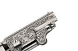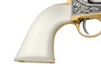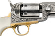 This rendition of the classic .36 caliber 1851 Navy revolver features the shorter 4" barrel in a silver finish that features beautiful laser engraved designs. The grips are a brilliant white polymer and the trigger guard is brass giving this pistol a truly stunning apperance. This gun is not only highly sought after by collectors but it is also fully functional and is lots of fun to shoot.