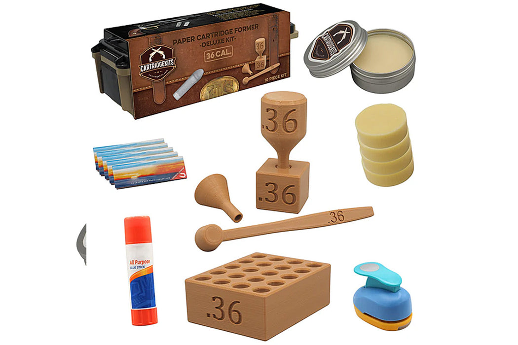 The CartridgeKits Deluxe .36 Caliber Cartridge Former Kit comes with the knob and block for .36 caliber cap and ball revolvers. It also includes a marked powder measure for consistent loads, and a funnel to keep things clean and simple. Also included are all of the items you need to make paper cartridges except for bullets and powder. This includes five packages of Elements rice paper rolling papers, a 5/8ths paper circle cutter, a large size All Purpose glue stick (or three small ones depending on availability), one 2oz can of lube, and 4 lube refills. Also our loading block and a project box.