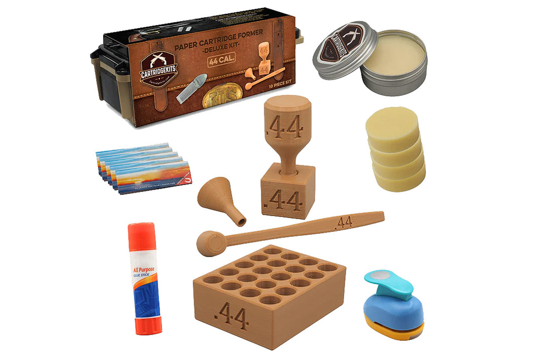 The CartridgeKits Deluxe .44 Caliber Cartridge Former Kit comes with the knob and block for .44 caliber cap and ball revolvers. It also includes a marked powder measure for consistent loads, and a funnel to keep things clean and simple. Also included are all of the items you need to make paper cartridges except for bullets and powder. This includes five packages of Elements rice paper rolling papers, a 5/8ths paper circle cutter, a large size All Purpose glue stick (or three small ones depending on availability), one 2oz can of lube, and 4 lube refills. Also our loading block and a project box.