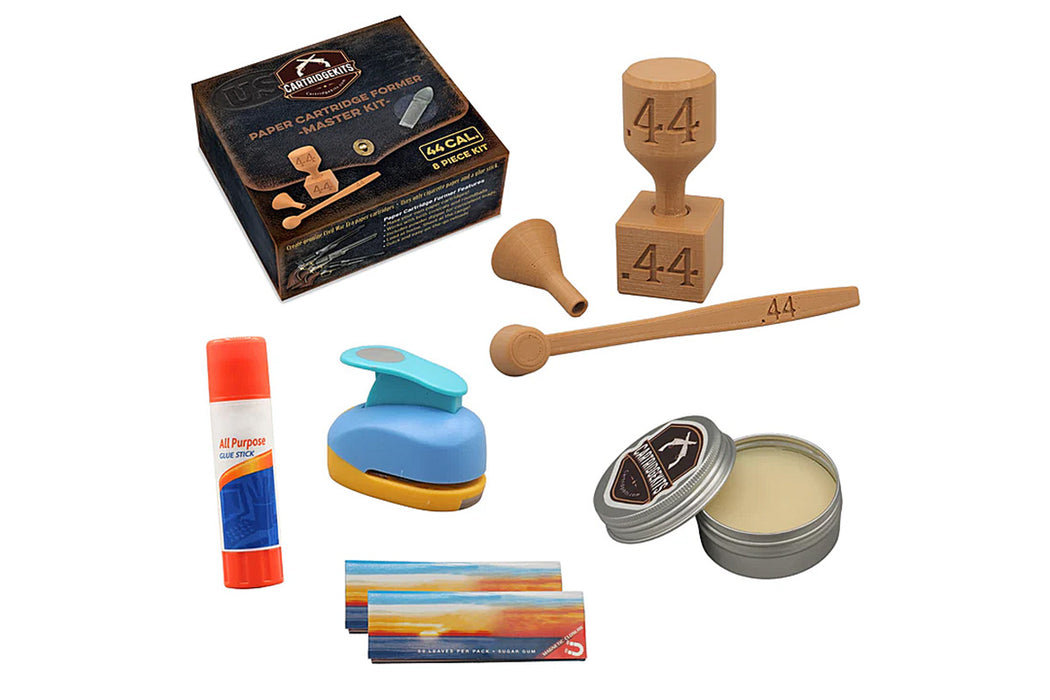 The CartridgeKits Master .44 Caliber Cartridge Former Kit comes with the knob and block for .44 caliber cap and ball revolvers. It also includes a marked powder measure for consistent loads, and a funnel to keep things clean and simple. Also included are all the items you need to make paper cartridges, except for bullets and powder. This includes two packages of Elements rice paper rolling papers, a 5/8" paper circle cutter, a regular size All Purpose glue stick, and a 2oz can of black powder lube.